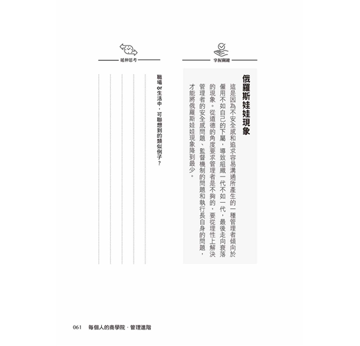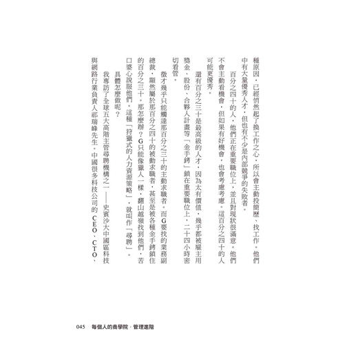 在上一本《每個人的商學院・管理基礎》中,作者以各階段的管理階層會遇到的問題與思維工具作為切入點,指引一位管理新手慢慢熟悉如何擔任一位主管;而在本書當中,作者則是徹底地教你成為一位公司高階管理階層,指明你必須要有的觀念與將會遇到的問題。我非常建議兩本書一起拜讀,如果你還沒經歷過相關挑戰,或許只能當作指引地圖來使用,但當你實際遇到問題之後,會發現其中的觀念一刀到位、針針見血,可以幫助你度過難關。