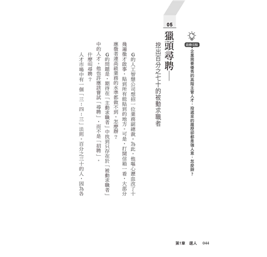 G只能像獵人一樣,翻山越嶺找到他們,苦口婆心說服他們。這種「狩獵式的人力資源策略」,就叫作「尋聘」。