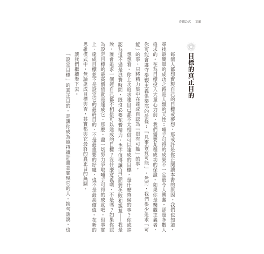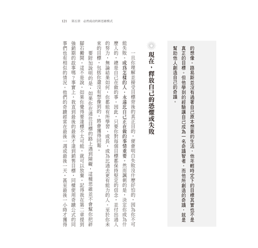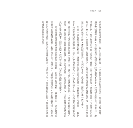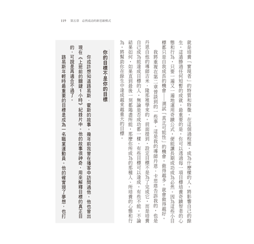 我還記得那一天,停下腳步回顧自己的人生,發現我能做的不只如此。我可以不只如此。我不再想原地踏步。我已虛度了青春年華,只付出最少的努力,卻想得到最大的回報,我無法再接受這樣的自己。所以我開始積極追求自己最大的目標,也不再認為只要在心裡清楚地將目標具象化,它們就會自動跑到我面前來。隨著時間過去,我發展出一套能將個人成長知識轉化為行動的過程。這些行動儘管既簡單又平凡,但以此為起點,可以展現出極佳的結果。