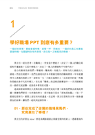除了好PPT的3大要素:令人驚豔的視覺美感、令人折服的邏輯內涵、不該踩的雷不要踩之外,職場人需要的簡報教學,應該是情境化的、可快速複製套用的,更重要的是,做出老闆想要的!這也正是本書的目的——告訴你「什麼是好的職場PPT」,並幫助你成為職場上的黑馬!