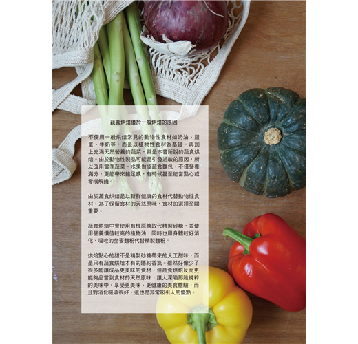 蔬食烘焙是以新鮮健康的食材代替動物性製品,使用當季蔬菜、水果,保留食材的天然原味和香氣,不僅營養滿分,更能帶來飽足感。