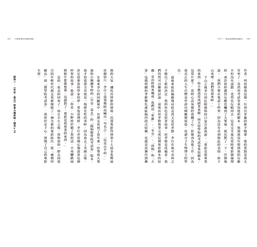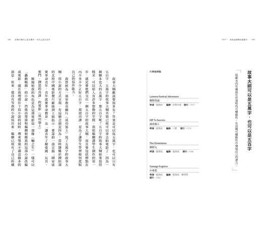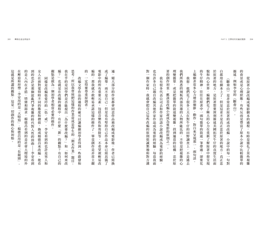 文學電影和電影小說有什麼不一樣?《牯嶺街少年殺人事件》的人物從二十個變成兩百個;「三廳電影」帶來錢潮,也帶來局限;《成功嶺上》扭轉了僵化的愛國主義,學生電影一再翻新。田野調查只是基本功課,故事的選擇要像顯微切片一樣精準。創作關乎思想,技術只能輔助;故事和風格都是為了描繪主題,角色之間的關係隨時都像化學變化一般質變,情緒節奏帶來如力學原理般的力量,劇情發展發展簡直像是一場考古發掘的過程。劇本結構是用來表達創作者的創作觀點和形式。