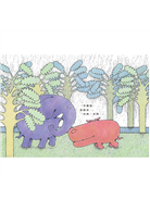 「走吧!走吧!散步去吧!」這單純不過的對話,搭配著再明確不過的圖示,不僅開啟了動物們的嬉遊,也輕易的喚起了小讀者的注意和投入。「你背我,我就去。」聽來好似小孩出門前對父母的撒嬌。小河馬、小鱷魚、小烏龜輪番上陣,和藹的小象二話不說,就讓散步的朋友一個個像疊羅漢那樣,跨上了牠的寬背,光是這樣的發展,就讓人覺得有趣極了。只是,這樣的有起有承,卻讓小烏龜成了「壓倒小象的最後一根稻草」。小象一個重心不穩,這幾個好朋友全都掉到池塘裡了。或許,有人會對接下來的情節預捏一把冷汗,但如果回到幼兒的閱讀體驗,那些與故事同在、每每活在當下的孩兒,說不定正在為小象失去平衡、全體跌落感到無比的暢快呢!因為那樣的過程好像他們平常在堆積木,在不斷堆高、堆高之後,他們往往又毫不顧惜的眼看著積木倒下。那一切歸零的感覺,前有躍動之感,後有破壞後的平靜,就像故事由轉而合,令人通體舒暢。尤其,動物們那種「天塌下來當棉被蓋」的表情,大致與幼兒的生活體驗吻合,他(牠)們總是對生活中發生的任何事,保持愉快的心情。而那種凡事都能好好享受的模樣,連大人看了,都不禁莞爾。