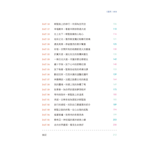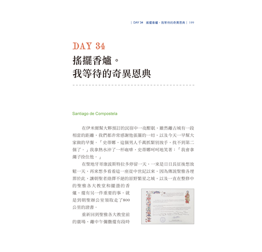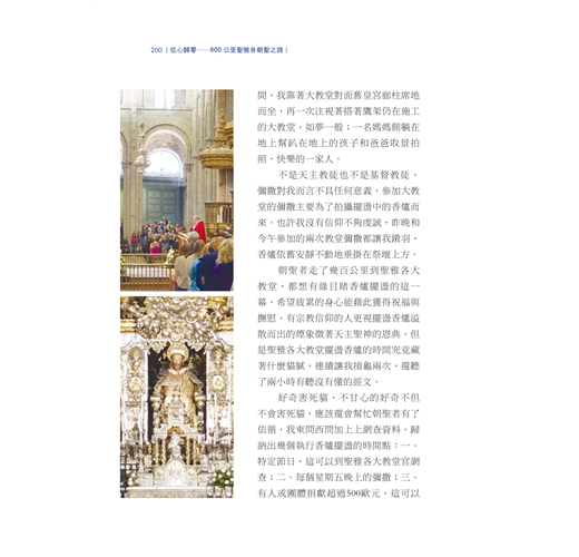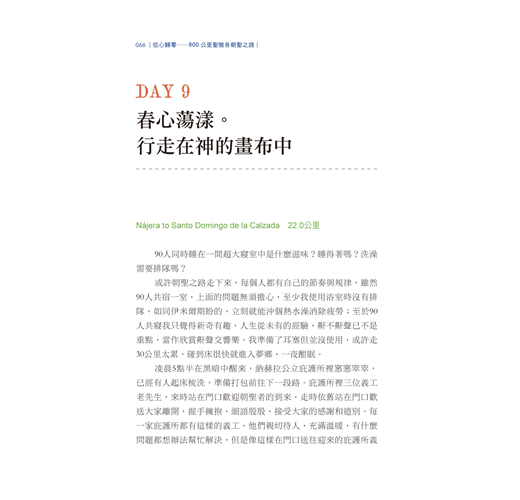 猶記日前,我翻開本書首頁,細細讀起,玉嘉直白且率真的「自我對話」就讓人讀來毫無包袱,他的用字淺顯,帶著大叔的優雅,也很能開自己玩笑。他從旅程一開始,就帶著讀者一同懷抱喜悅、興奮和未知出發,沒想到才啟程不久,他就抱怨起自己太逞英雄,背了太多行囊上路,看著莞爾一笑的瞬間,突然覺得,他的朝聖之旅,似乎也帶著我們,重新省視那些人生中,未曾好好思量的課題——「捨不得的顧慮,都該放下」;他的朝聖,為心靈和信仰,找到答案;不也正為讀者引路,讓我們重新看待自己。