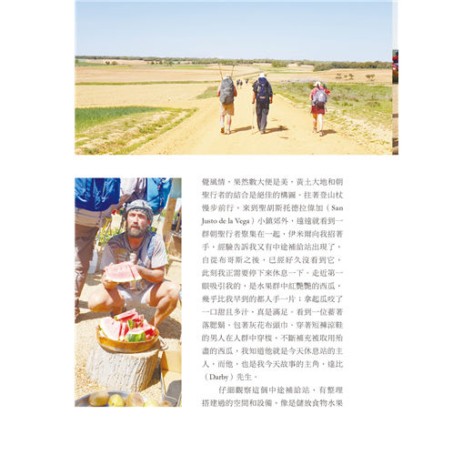沿路的小麥田農人開始收割翻土,眼前一片土黃的世界,不同的視覺風情,果然數大便是美,黃土大地和朝聖行者的結合是絕佳的構圖。拄著登山杖慢步前行,來到聖胡斯托德拉偉加(San Justo de la Vega)小鎮郊外,遠遠就看到一群朝聖行者聚集在一起,伊米爾向我招著手,經驗告訴我又有中途補給站出現了,自從布哥斯之後,已經好久沒看到它,此刻我正需要停下來休息一下。走近第一眼吸引我的,是水果群中紅艷艷的西瓜,幾乎比我早到的都人手一片;拿起瓜咬了一口甜且多汁,真是滿足。看到一位蓄著落腮鬍、包著灰花布頭巾、穿著短褲涼鞋的男人在人群中穿梭,不斷補充被取用殆盡的西瓜,我知道他就是今天休息站的主人,而他,也是我今天故事的主角,達比(Darby)先生。