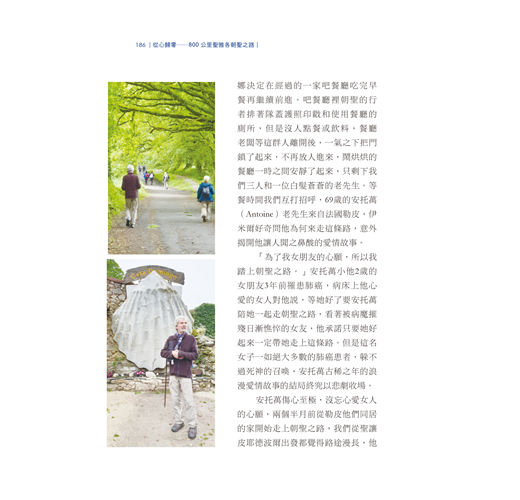 這是一趟充滿自我對話,充滿故事的旅程。整整36天的朝聖之旅,玉嘉寫下超過36個故事的經歷,那些來自四面八方的朝聖者,成了書中一個個充滿故事的人,而故事本身與路程所見所聞,皆引人入勝。無論是相伴而行的美國情侶、婚姻遇上考驗的丹麥老夫妻……,玉嘉筆下的他們,有的走在幸福路上,有的對生命意義感到迷惘,憑藉此書,我們也像是在「書中朝聖」般,思索著這趟旅程中,生命的真義。