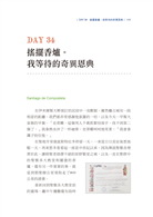 這是一趟充滿自我對話,充滿故事的旅程。整整36天的朝聖之旅,玉嘉寫下超過36個故事的經歷,那些來自四面八方的朝聖者,成了書中一個個充滿故事的人,而故事本身與路程所見所聞,皆引人入勝。無論是相伴而行的美國情侶、婚姻遇上考驗的丹麥老夫妻……,玉嘉筆下的他們,有的走在幸福路上,有的對生命意義感到迷惘,憑藉此書,我們也像是在「書中朝聖」般,思索著這趟旅程中,生命的真義。