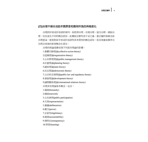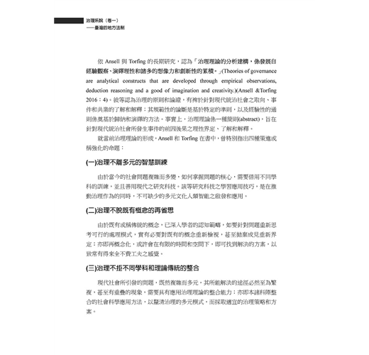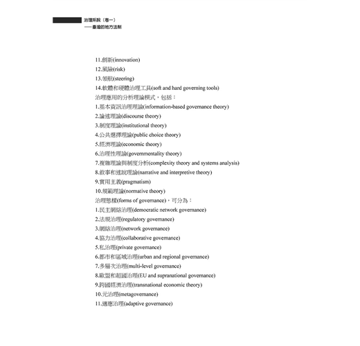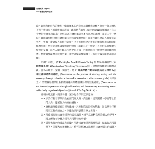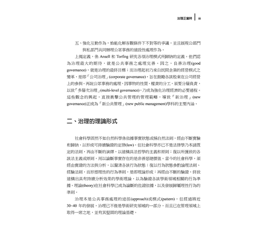 上揭定義,係Ansell和Torfing研究各項治理模式所歸納的定義。他們認為治理最大的期待,就是公共事務之處理完善。因之,良善治理(good governance),就是治理的最終目標;而治理起初乃來自民間企業的經營模式之變革,是即「公司治理」(corporate governance),旨在鼓勵各該股東在公司經營上的參與。再說公眾事務的處理,因事物的性質、權責的分工,須要分層負責,以致「多層次治理」(multi-level governance),乃成為強化治理經濟的必要過程。這些觀念的興起,直接衝擊公共管理的管理範疇,導致「新治理」(new governance)正成為「新公共管理」(new public management)學科的主要內涵。(節錄)