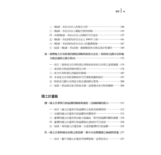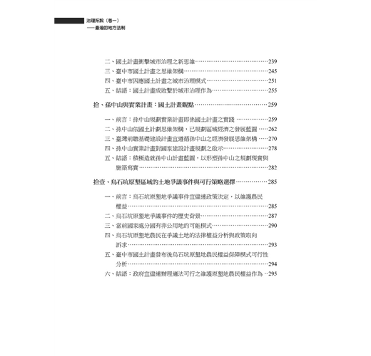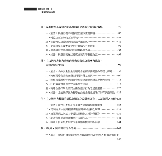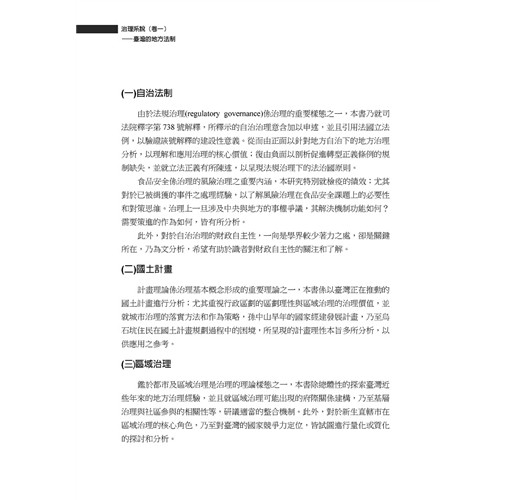 本專書係就近四年來在國內外學術研討會發表,並已在學術期刊刊載之論文,依其論文探討主題,經加整理,並以最新之數據或文獻,重加修正後編輯為上下二冊專書。上揭三十篇論文,多在探討治理模式,且以地方自治法制、地方治理為主軸,進行實證研究。