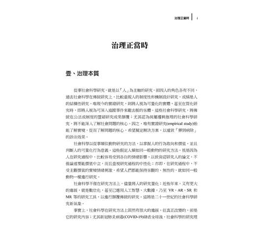 事實上,社會科學在研究方法上固然有很大的進展,但真正改變的,卻是它的研究內容;尤其新冠肺炎病毒(COVID-19)肆虐全球後,社會科學的研究理論,必然有劃時代的變革。儘管變革的內容尚在醞釀和詮釋,但有一個主軸卻不僅不會消失,而且會擴大形成。此即是「治理」(governance)這個概念。在二十世紀七O年代以來,已經成為社會科學研究不可忽視的課題;直至二十一世紀,其理論形成已在社會科學占有極重要的地位。這是社會科學以人為量化研究外,更進一步發現人的結合力量,已不僅在於政治菁英的權力作用或民間的協力作用,更在於深植國家動力的根基。面對二十一世紀不可逆的氣候變遷所肇致的災難,以及人類不輕易所造次的人禍,可能遠比核子戰爭更加危難和損害。在在需要凝聚全民的力量,並在國家威權領導下,始可有效克服和減緩災難。