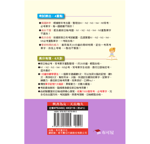 在完整的歸納之後,本書必能伴您輕鬆通過N1~N5檢定考試,本書並希望您在完全掌握N1~N5必考、常考單字,提高聽讀能力之後,藉此汲取日本最新資訊、最新消息、最新流行,創造最新商機。