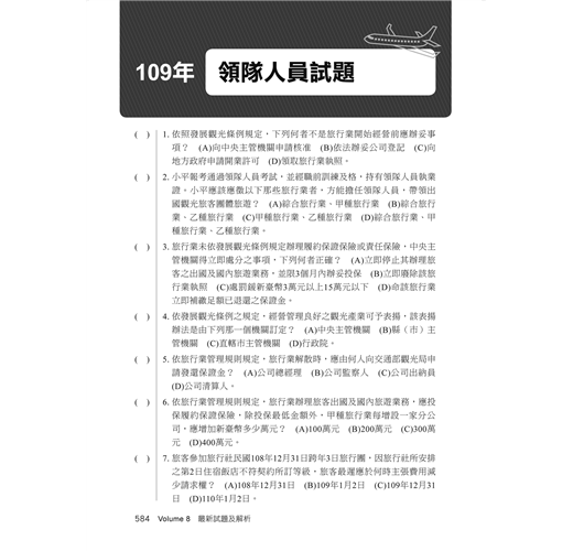 今年度(109年)的領隊導遊實務(二)考試試題,仍集中於「發展觀光條例」、「旅行業管理規則」、「民宿管理辦法」、「領隊人員管理規則」、「導遊人員管理規則」、「護照條例」、「臺灣地區與大陸地區人民關係條例」、「大陸地區人民來臺灣從事觀光活動許可辦法」等法規。