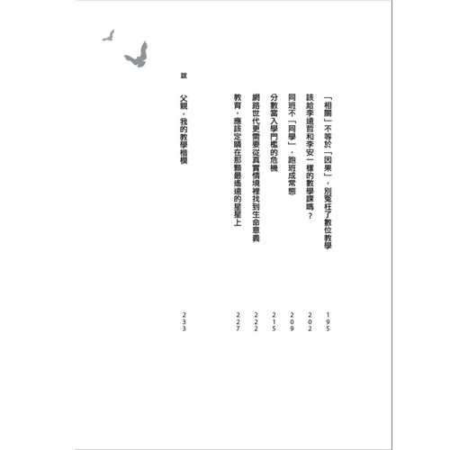 這本書的內容,主要是我二○一六到二○一八年在《親子天下》雜誌上寫的專欄文章,主題都和教育、教學有關,包括一○八課綱、素養、讀寫、弱勢教育等。專欄結束後,有天《親子天下》出版暨產品企劃部的佩芬建議我,也許可以把這些文章中最受關切的主題整理出來,再補上幾篇,就可以單獨成書,以後更容易分享,我被她說服了,就有了這本書。