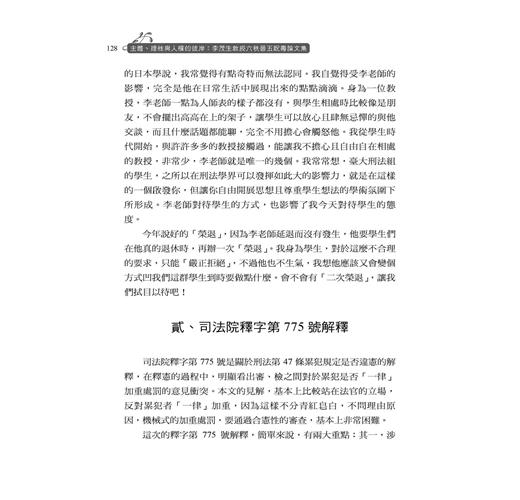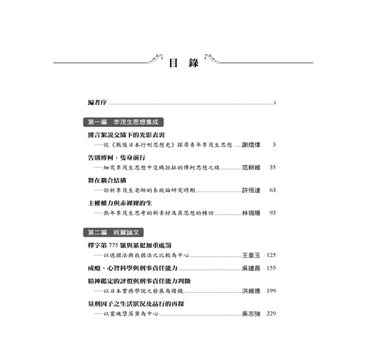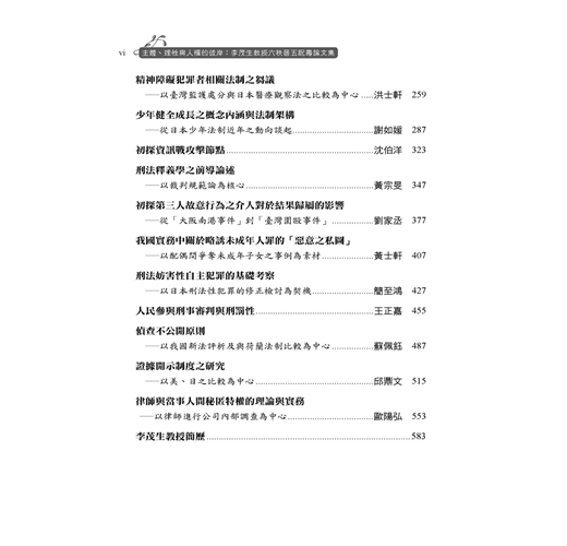 在這本祝壽論文集中,一共收錄了19篇論文,除了4篇李茂生教授思想集成之論文外,撰稿人選擇的題目非常多樣,涵蓋了刑事法學的各個面向,有偏重刑事制裁與量刑之論文,例如累犯加重、精神鑑定與責任能力、量刑因子之探究、精神障礙犯罪人之處遇;有偏重政策論者,例如日本少年事件處理法之動向、資訊戰攻擊節點之研究;有偏重實體刑法面向者,例如刑法釋義學之探討、第三人故意行為介入之結果歸屬、略誘未成年人罪之研究、日本妨害性自主犯罪之修正;有偏重刑事訴訟法面向者,例如人民參與審判、偵查不公開、證據開示制度、律師之密匿特權等議題之探討。此外,本論文集的最精華之處在於,每篇論文的文末,李老師均撰寫其個人的想法,有的是與撰稿人對話,有的是評論或批評,但更多的是他的個人回憶與自我對話。