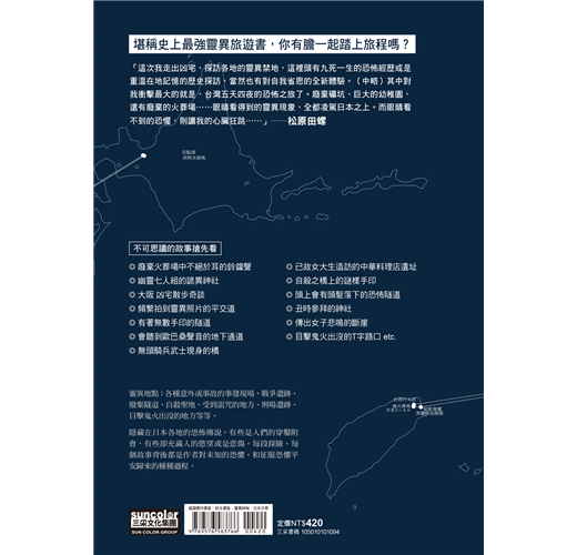 堪稱史上最強靈異旅遊書,你有膽一起踏上旅程嗎?「這次我走出凶宅,探訪各地的靈異禁地,這裡頭有九死一生的恐怖經歷或是重溫在地記憶的歷史探訪,當然也有對自我省思的全新體驗。(中略)其中對我衝擊最大的就是,台灣五天四夜的恐怖之旅了。廢棄礦坑、巨大的幼稚園,還有廢棄的火葬場……眼睛看得到的靈異現象,全都凌駕日本之上。而眼睛看不到的恐懼,則讓我的心臟狂跳……」 ──繁體中文版獨家作者序