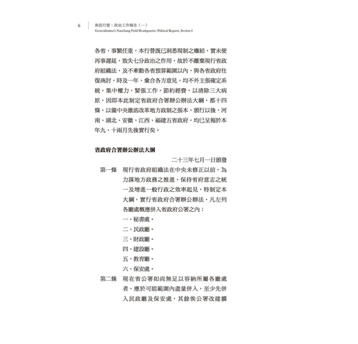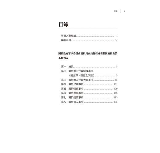 「南昌行營」系列,以國民政府行營設置史上最重要的南昌行營為核心,本集收錄「國民政府軍事委員會委員長南昌行營處理勦匪省份政治工作報告」(以下簡稱「政治工作報告」),共二冊。