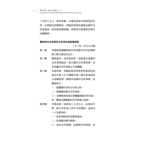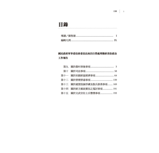 「南昌行營」系列,以國民政府行營設置史上最重要的南昌行營為核心,本集收錄「國民政府軍事委員會委員長南昌行營處理勦匪省份政治工作報告」(以下簡稱「政治工作報告」),共二冊。