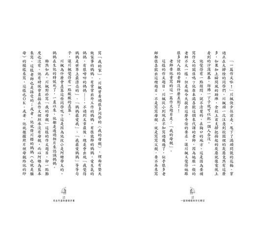 雖然如此,川楓對於寫「我的母親」這樣的作文題目,卻一點難度也沒有。他有時候會直接在作文裡坦承沒有母親,而以阿嬤為藍本來寫,這樣老師也是接受的;或者,他就借川櫻的媽媽(也就是繼母)的模樣來寫,這樣也OK。或者,他就根據照片裡母親給他的印象,加上一點想像力來寫,結果老師也照樣讓他過關,他開始有一點懷疑老師有認真看他的作文嗎?也或許老師們在意的是他的國語文造詣,而不是類似的作文內容是否有一致性。