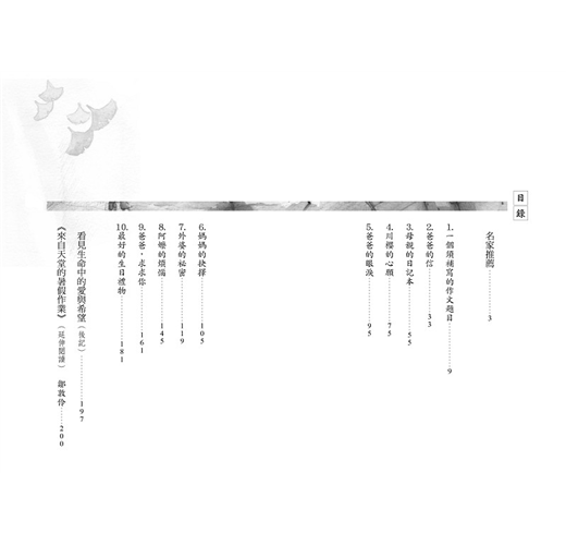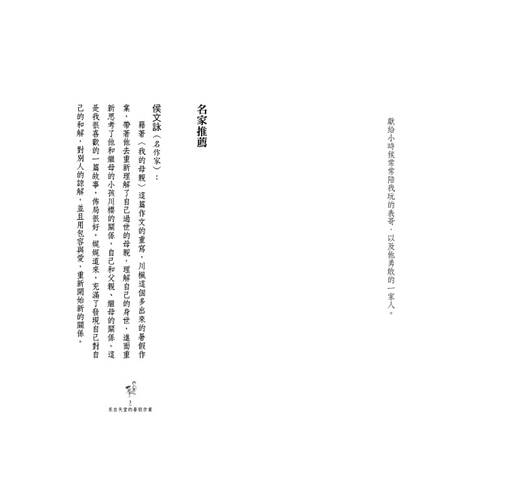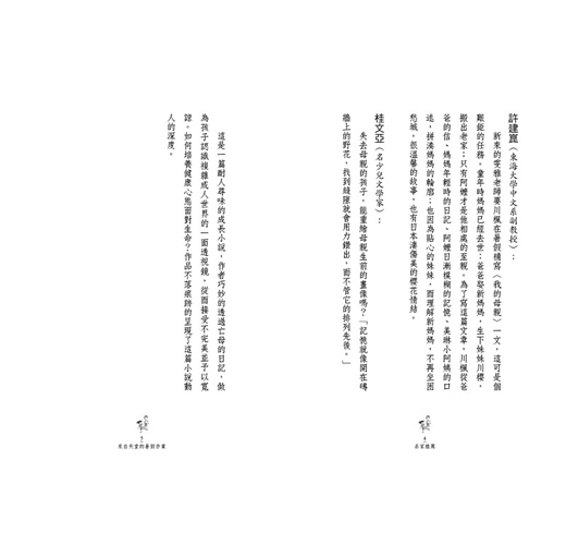 名人推薦:藉著〈我的母親〉這篇作文的重寫,川楓這個多出來的暑假作業,帶著他去重新理解了自己過世的母親,理解自己的身世,進而重新思考了他和繼母的小孩川櫻的關係,自己和父親、繼母的關係。這是我很喜歡的一篇故事,布局很好,娓娓道來,充滿了發現、自己對自己的和解,對別人的諒解,並且用包容與愛,重新開始新的關係。