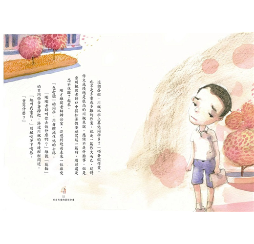 他覺得有一點煩悶,說不清楚的,在胸口的地方。這是因為要補寫作文的關係嗎?他原本滿喜歡這個來代課的老師,因為她跟一般的老師不大一樣。但是她今天提出這麼奇怪的要求,讓川楓又覺得她跟很多討人厭的老師沒什麼差別了!