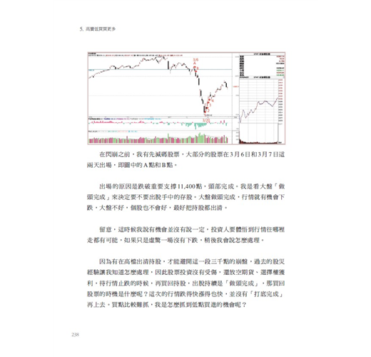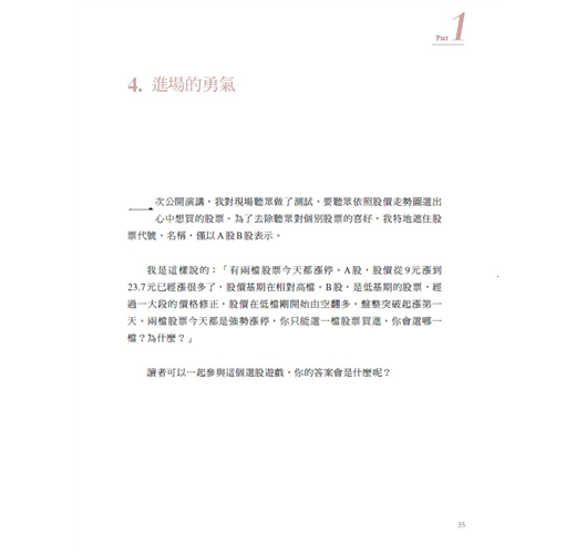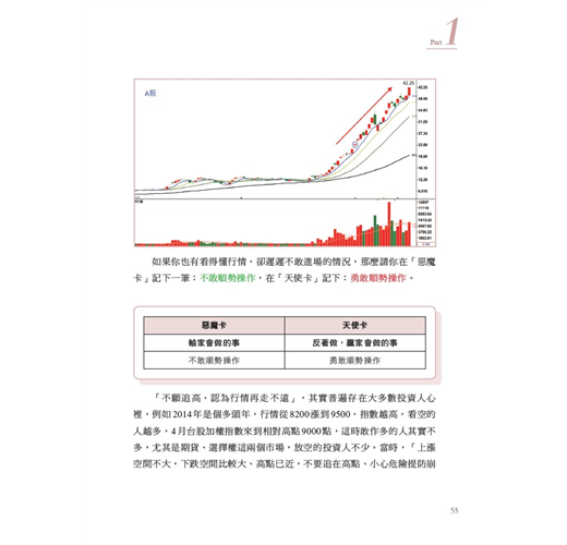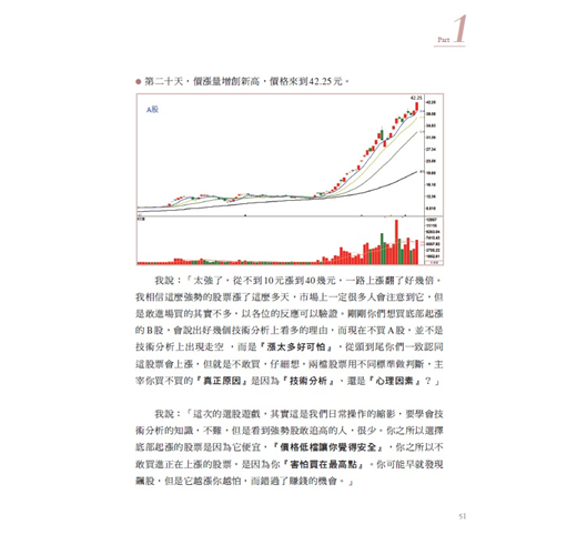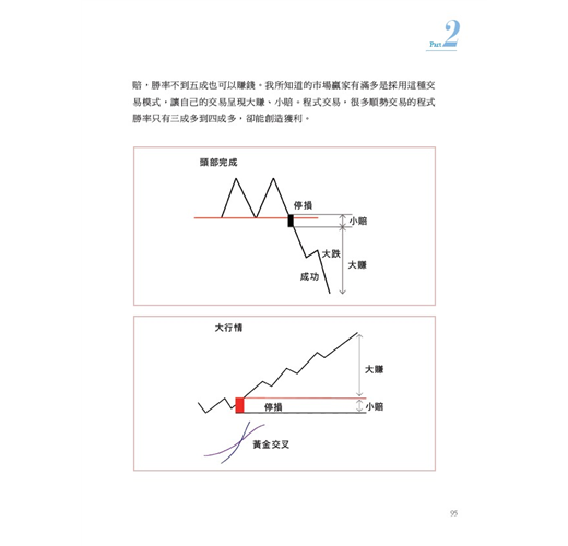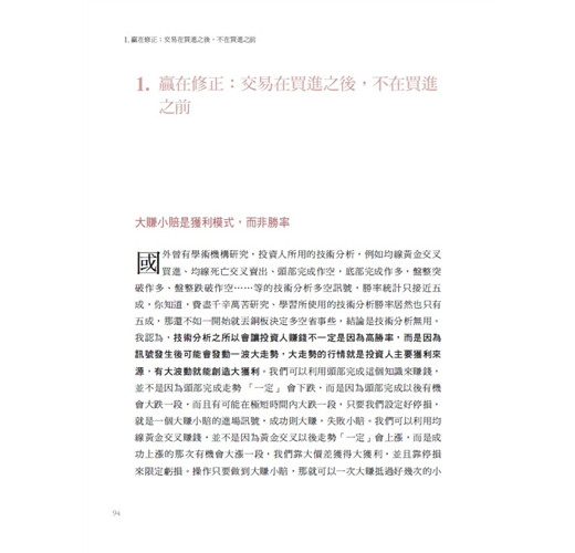 這本書分成三個部分,第一部分列出從散戶到專職交易人的關鍵改變。原來,以前我都把重點放錯地方,我放在技術分析、研究基本面和追蹤籌碼上。將這些資訊當做交易的依據,可能對也可能錯。因為只要有心,技術線型可以騙線、財報可以美化、籌碼可以當誘餌、消息可以掩飾出貨。市場沒有什麼是確定的,真真假假,而以前的我卻把重點放在這些不確定的事情上。其實,賺賠的重點不在買進之前的分析,而是在買進之後的部位處理,和部位規模的設定。在這個部分裡,我以這個重點為基礎,開門見山的分享要擺脫輸家模式,成為贏家模式的關鍵改變有哪些,列舉出多條投資人常犯的錯誤,並且一步一步的給予投資人建議。看完這個部分,你將會豁然開朗。