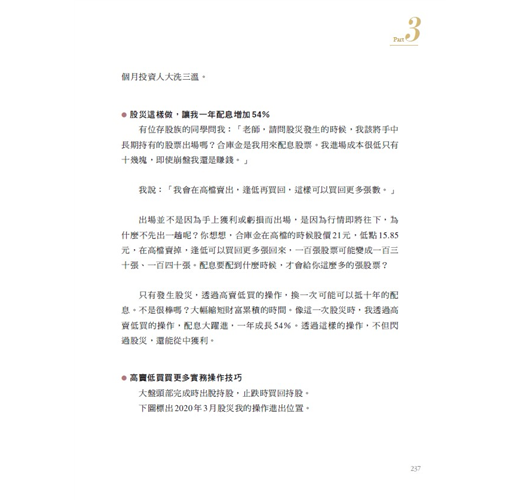 第三部分,是實戰篇,討論順勢交易的重要,並從實戰中體驗順勢長線交易與修正的威力。債券天王葛洛斯說:「把注意力關心未來三到五年,就等於在心裡給自己打個暗號,告訴自己投資不是賭博,而是建立長期布局。這同時可以幫助你降低投資決定時所產生的貪婪與害怕。」這裡葛洛斯所說的「長期(布局)觀點」就是「順勢交易」。《海龜投資法則:揭露獲利上億的成功祕訣》這本書的作者克提斯說:「我的績效之所以遠遠超過其他海龜學員,是因為我找到有趨勢、且漲不停的商品」。想要有大的獲利,必須順勢交易且做長線,抱得住獲利部位,這是投資者主要的獲利來源。傑西李佛摩也說:「獲利是坐著等出來的」。這一部分要教給讀者一個簡單、有效率的股票波段操作法則「主力成本線控盤」,這個賺錢的方法讓你一學就會,並且加以巧思,讓這個均線操作方法威力放大,教你如何股票越滾越多張。在第五章裡,借用股票獲利上億的營業員投資心法,讓你不再害怕下跌,資產可以倍數成長;第六章分享華爾街操盤人的操作密技,讓你加碼不用錢,有機會股票百張滾千張,觀念改變,讓你股票上漲賺錢,股票下跌也賺錢。只要照著方法持之以恆的做,財富可以倍增。最後提到選擇權,第七章提到如何操作選擇權買方倍數獲利,用簡單的技巧可以得到大大的回報,第八章提到如何用選擇權賣方賺取現金流的方法,文章淺顯易懂,沒有艱深的理論只有實戰獲利方程式,讓不懂選擇權的投資者也能夠快速學會並且樂在其中。