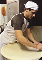 為了兼顧採訪,我要求參觀在廚房製作的情形。薄薄的麵皮抹上史特拉奇諾起士,撒上大量橄欖油,上頭再蓋上另一片薄麵皮,然後再撒上橄欖油。