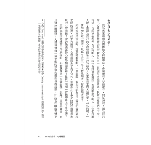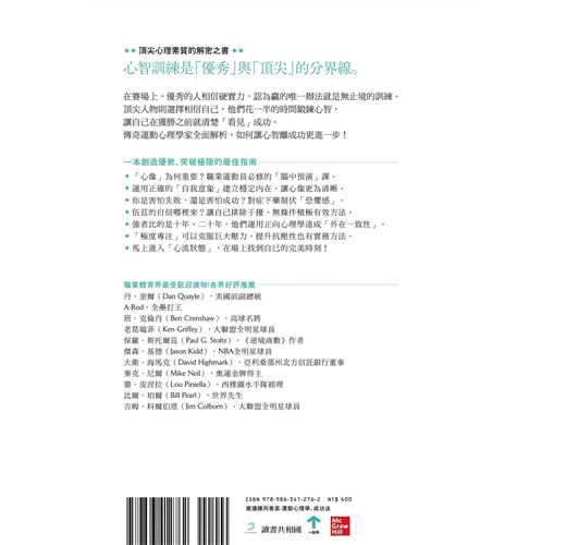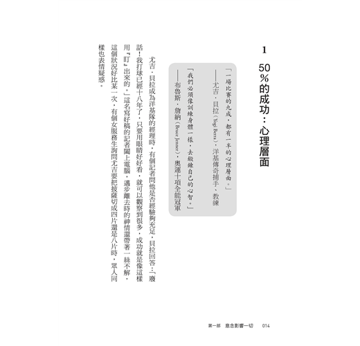 「每個人都有一定的天賦,身為運動員,我們必須將潛能最大化。這本書是絕佳的教戰手冊,訓練你的心智,讓你的表現保持巔峰。」