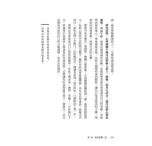研究證明,心智訓練不僅可以幫助人更上一層樓、提升生產力,還可以使心情更愉悅。無論年齡,從事何種領域的活動,你都能學習更有效地運用自己的思維。你能學到保持專心,學會處理逆境,在陷入瓶頸時保持動能。讓自己免受致命的干擾。學會如何追尋夢想,找到生活的目標。