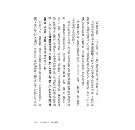 如果答案是肯定的,那麼請看我的下一個問題:假如你認為自己最佳和最差表現之間的差異,如尤吉所言,心理層面至少占了50%,那麼你花了多少時間在影響你表現的心智訓練?讀過幾本運動心理學相關書籍?你從「頭腦」教練那裡上了多少課?