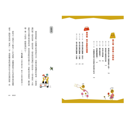 最令人心有戚戚焉的是,她並沒有被親子教養這頂大帽子遮蔽目光,窄化了閱讀的目的與樂趣。在討論這些書的同時,她不斷強調:自己、他人和世界才是這本書的主軸。她希望透過閱讀這些繪本與童書,我們能拋下成人的主觀,回憶起自己曾經是個孩子。因此,所謂的教養並不是高高在上去指導孩子,而是習慣孩子、熟悉孩子、了解孩子,以及大人自己的內心小孩。