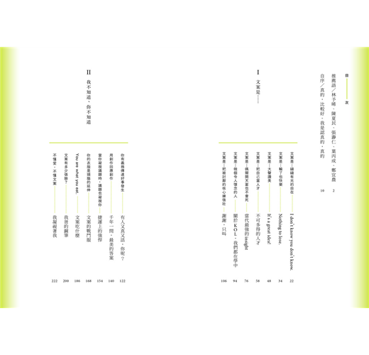 看完這本書,你會發現,真正好文案的關鍵不在於句子,而在於你要創造並傳遞什麼樣的正面價值給你的 TA;讓大家過得更好,或心理更愉悅,進而認同你要推的事物或品牌。一個能感動人的文案,是在這根本的價值,而不是動人的話語。動人的話語只是一時的,一陣子就沒了;但只有創造能讓人認同的正面價值,持續發聲,讓這價值成為別人認同你的理由。這樣的文案,才能夠經得起時間的考驗。