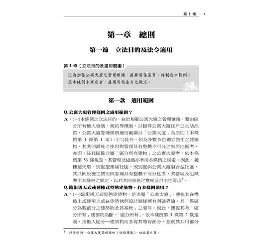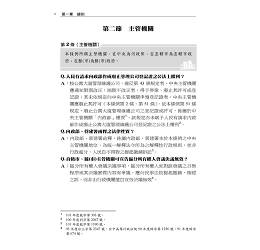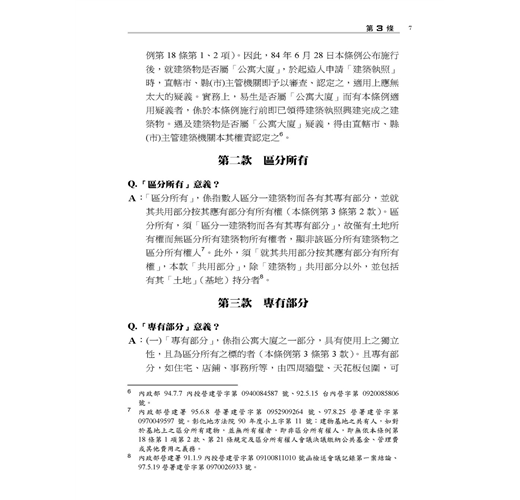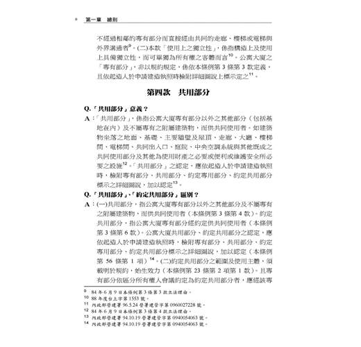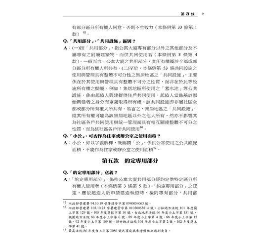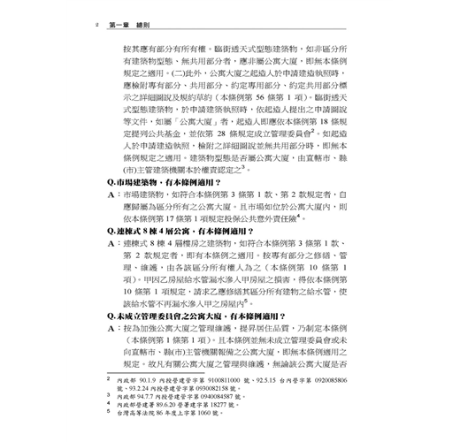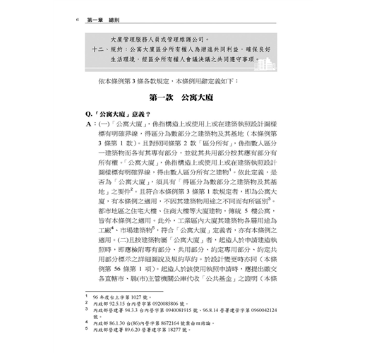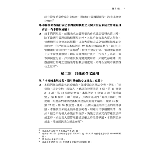 本書主要以各主管機關函釋為憑,並佐以確定裁判見解;在每一個法律問題儘可能幫民眾解惑,以利瞭解法律規範及自身權益。部分爭議,標註實務上不同見解及著者愚見。民眾如盼更詳細或體系性瞭解本條例規範,懇請參閱拙著「公寓大廈管理條例(逐條釋義)」,或於司法院、內政部營建署、地政法規查詢系統、台北市法規查詢系統等主要網站搜尋見解全文。