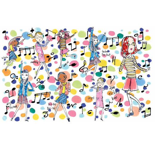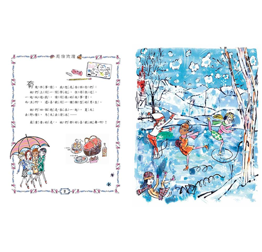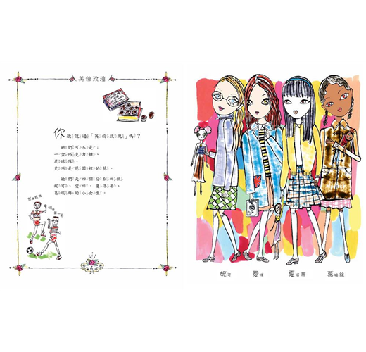 寫故事的人是風靡全球的美國歌手瑪丹娜,插畫家傑佛瑞搭配上流行天后,竟迸出充滿時尚元素的繪本,畫風十分稀有、獨特。舉例來說,故事寫到「她們都好喜歡跳舞啊!」繪本中就設計一頁跨頁,以60年代流行的波爾卡圓點繪成背景,「英倫玫瑰」在這裡大展各種舞姿,狐步舞、嘻哈舞、迪斯可舞等。如果這個畫面出現在其他繪本,可能略有違和感,但在本書,時尚自然呈現,各種年齡層的讀者都會被這樣精心設計、時尚感滿分的主角和場景吸引。
