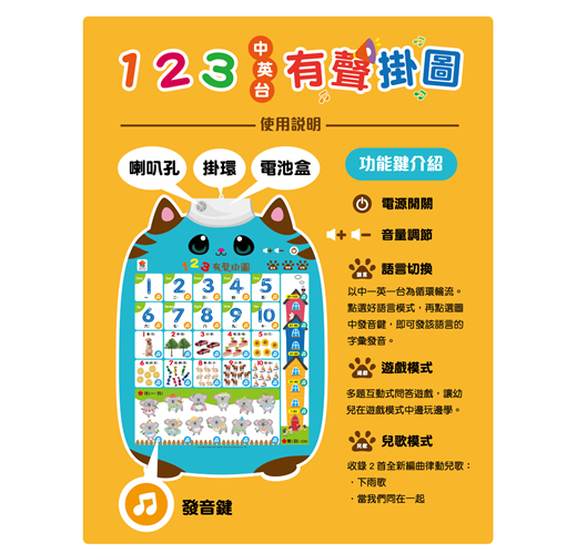 ●簡單操作:一鍵切換三種語言(中、英、台)模式,英文請來專業外語錄音員錄製,發音純正,讓孩子從小接觸標準的三語聽力與口說,建立正確語言觀念。