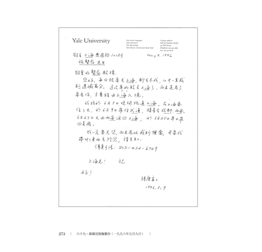 六十九、孫康宜致施蟄存(一九九六年五月九日)