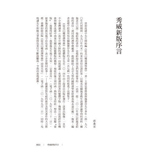 《從北山樓到潛學齋》的簡體版首先在二○一四年由上海書店出版社發行。該書出版後,一直有不少臺灣讀者(甚至中國大陸的朋友)向我建議,希望能讀到該書的繁體字版。幾個月前我終於有機會與編者沈建中商量有關出版繁體版的構想,他收信後立刻回函,熱情地支持此一想法:「您擬『臺版』,我覺得好事,我想施先生地下有知,一定會首肯」。(電子函,二○一九年八月三十一日)。接著施老的孫兒施守珪也來函,表示非常贊同此事:「……感謝您對先祖的推崇及對其著作的大力推薦。臺灣如能出版《從北山樓到潛學齋》功莫大焉」。(電子函,二○一九年九月一日)。同時,馬鳴謙先生和陳文華教授也來信不斷鼓勵我,令我由衷地感激。