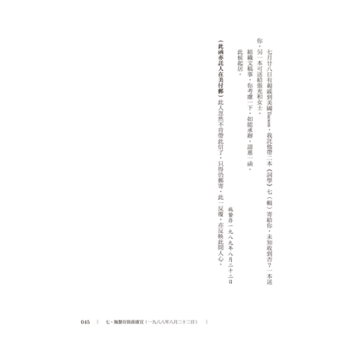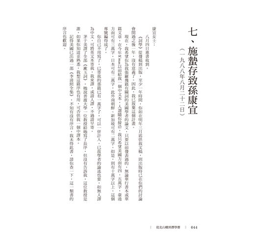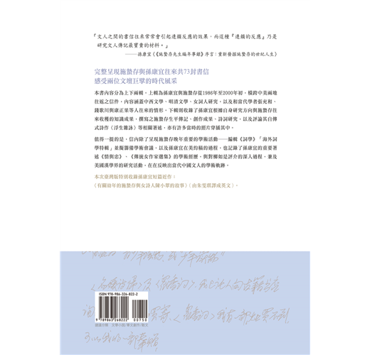 值得一提的是,信內除了呈現施蟄存晚年重要的學術活動──編輯《詞學》「海外詞學特輯」並擬籌備學術會議,以及孫康宜在美約稿的過程,也記錄了孫康宜的重要著述《情與忠》、《傳統女作家選集》的學術經歷,與對柳如是評介的深入過程,兼及美國漢學界的研究活動,在在反映出當代中國文人的學術軌跡。