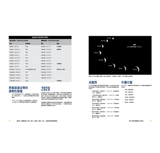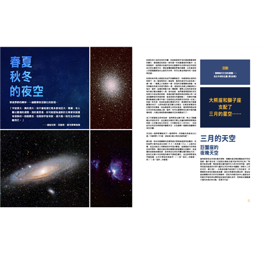 作者運用清楚明瞭的圖表,帶領讀者從基本天文概念入手:從如何描述各個天體的位置、角度,不同季節的星象差異,直到如何拍出亮眼、清晰天文影像的教學,並且彙整了2020~2024年不可錯過的重大天文事件。