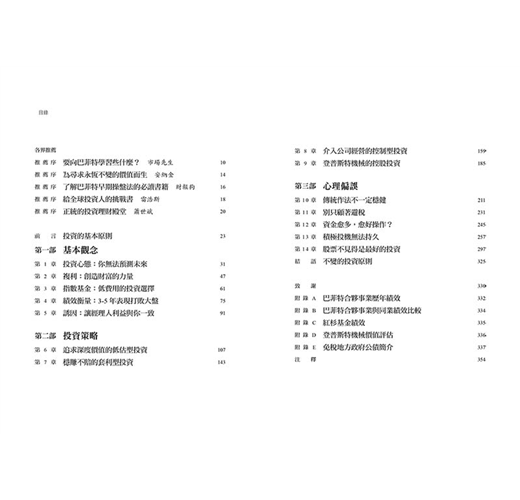 本書的內容嚴謹,將巴菲特合夥基金時期的股東信按照不同的主題整理出來,共分為三部分:第一部分的基本概念篇解釋了投資原則,複利的力量和合夥事業的規範;第二部分則列出了投資策略個案,讓你知道不同類型的價值投資策略;第三部分則解釋了心理偏誤的概念,這三大部分提供了重要的指引。