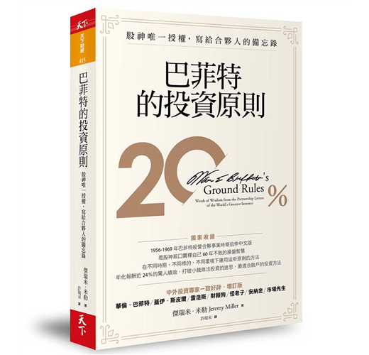 《巴菲特的投資原則》這本書,是作者傑瑞米.米勒對巴菲特合夥事業時期股東信的整理。他將這14年的信分門別類,試圖建立一套架構,介紹巴菲特早期的投資方式。巴菲特在2015年的年度股東信推薦這本書:「米勒對巴菲特合夥事業做了出色的研究和調查,並且詳細解釋波克夏是如何發展至今。如果你對投資理論與實務深感興趣,你會喜歡這本書。」