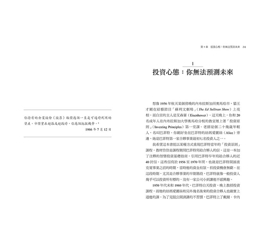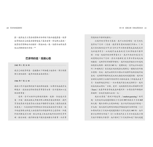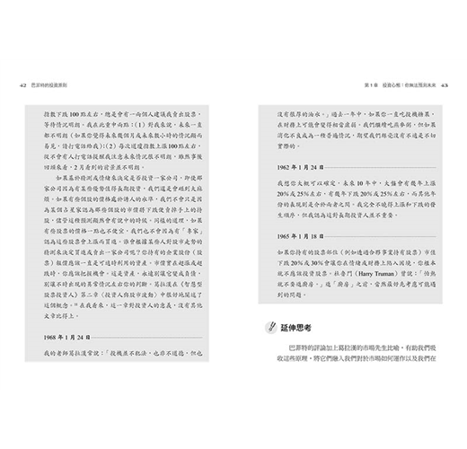 而每個章節都以作者敘述、引述信件和延伸思考三個環節,充分地讓我們了解巴菲特在合夥事業基金時期的各種想法。