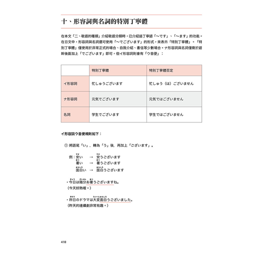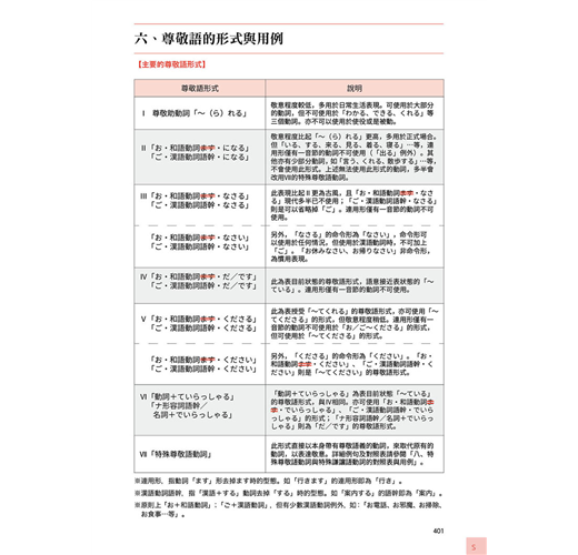⑥敬語特別篇,則是系統性地整理了N1考試當中所需要的敬語知識,詳細介紹「尊敬語」、「謙讓語」、「丁重語」、「特別丁寧體」、「素材敬語」、「對者敬語」…等,在高階敬語使用上不可不知的觀念。亦加入曾經於N1考試中出題過的特殊尊敬語、謙讓語動詞用例,讓學習敬語不再只是淪落於表格上的背誦,而是掌握如何實戰使用。