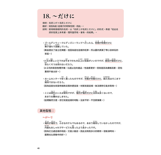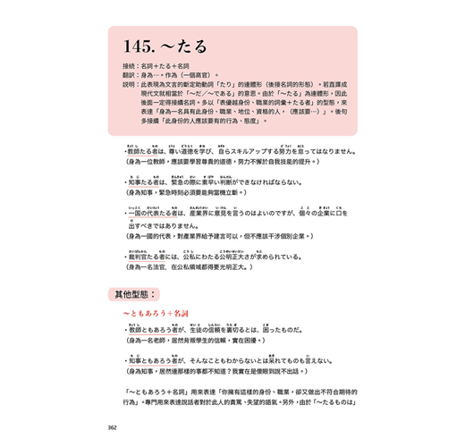 ②每項文法除了詳細說明外,各個例句亦附上假名讀音以及中文翻譯。