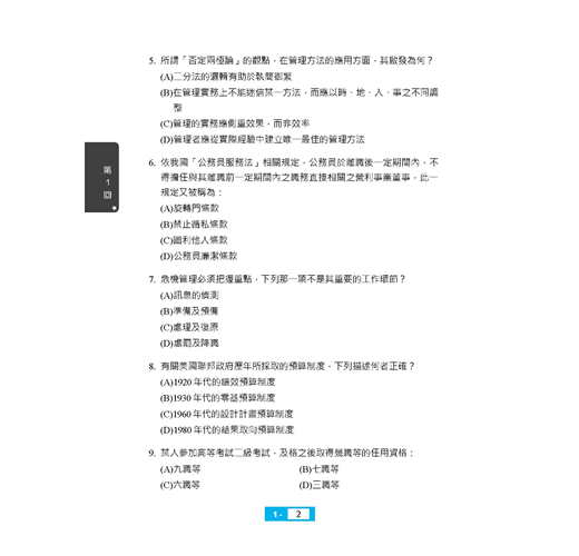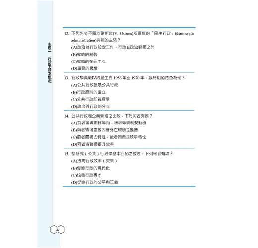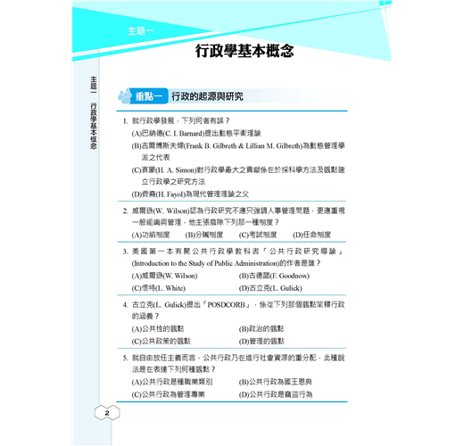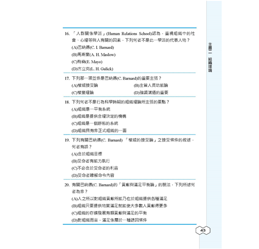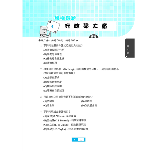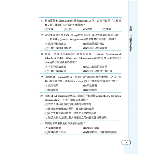 ★行政學大意題庫攻略全書收錄大量試題,包含主題式分類題庫565題+模擬試題200題+歷屆試題350題=1115題,題題詳解,100%完整解析!★全新版本,收錄103~109年初等考試試題,所有題目皆由三民輔考專業名師提供詳盡解析,透過大量練習必能在考試中脫穎而出!【適用對象】這本《行政學大意題庫攻略》適用於報考「初等考試、地方特考五等考試、身心障礙人員五等考試、原住民族五等考試」一般行政類科,及國安局特考五等行政組的考生。【考試資訊及報考利多】◎初五等考試:初等考試不限學歷,凡是年滿18歲的中華民國國民皆可報考。該考試每年固定舉辦,提供不同領域人才的公職就業機會。考生可依自身學習背景及興趣來選擇自己喜歡的類科,應考科目大多都是學校的必修科目,讓各類科考生在報考時就擁有一定程度的競爭優勢。初等考試只考四科,且全為選擇題型,一經錄取起薪可達三萬元,並享有完整公務員福利,絕對是有心在公職領域打拼的最佳入門選擇!相較於初考由中央政府開缺,全國統一選填志願分發;地方特考則是由各地方政府開缺,採分區報名、分區錄取的方式,工作地點離家比較不會過遠。加上地方特考與初考考試時間差不到1個月,因此以初考為目標的考生也可以加報地方特考五等,一次準備,二次上榜機會。【一般行政類科介紹】一般行政類科工作範圍廣泛,從中央到地方各級單位都有人力需求,每年缺額量多穩定。其工作簡單易上手,且考試科目無特殊專業背景要求,懷抱公務員夢想、喜歡行政庶務的考生,可以優先選擇此類科報名。一般行政的工作內容,由於是針對普通行政事務而開設,因此工作涵蓋很廣,多以例行性事務為主,像是文書處理、事務管理、物料採購、出納、打字等,不會牽涉到太多的專業技能。也因此,考上一般行政類科公務員,將來遇缺所能申請分發的單位,廣度也居各類科之冠,最有機會調回住家附近,因此是多數公職考生的第一選擇!※應試正確資訊請以考試簡章為準※【本書特色】行政學又稱公共行政,研究的是如何經營一個政府的學問,也是和許多學科之間不斷融合演化的新興社會科學。行政學的範疇包括「公共政策」、「公共管理」、「人事行政」、「府際關係」、「政治學」等,甚至連「心理學」和「經濟學」都包含在內,由於其範圍既深且廣,常造成許多考生在準備上抓不到方向。考生的心聲我們都聽到了,三民輔考專業團隊特別為廣大的考生編著了這本「行政學題庫」,並根據初五等考試行政學大意考科的命題大綱收錄了大量試題,包含主題式分類題庫565題+模擬試題200題+歷屆試題350題,共1115題。所有題目皆由三民輔考專業名師為考生提供詳盡解析,透過大量試題演練,必能使考生克服考生不安的緊張情緒,以便在考試中大放異彩!本書特色如下:第一部分 主題式分類題庫針對報考初五等考試的考生,本書精心統整了七大主題,包括「行政學基本概念」、「組織理論」、「人事與財務」、「公共政策與決策理論」、「行政環境」、「行政運作與管理技術」、「行政責任與倫理」,所有題目皆有詳盡解析,有助讀者統整考題性質及出題脈絡!第二部分 模擬試題熟悉考試題型與出題方向是應考時能否獲得高分的關鍵之一,考生備考時一定要多練習相關題目,考試時才能穩定發揮實力。本書第二部分〈模擬試題〉仿照初五等考試行政學大意考科的題型,替考生整理了4回模擬試題,每回50題,透過實戰模擬演練,快速鍛鍊答題技巧與速度,同時有效掌握考試重點及方向!第三部分 歷屆試題收錄103~109年公務人員初等考試行政學大意考科試題,共7份,讓考生鑑往知來,掌握行政學大意考情趨勢!所有試題皆附詳細解析,透過勤做試題演練,必能在應考時繳出漂亮的成績單!【考生上榜心得1】:初等考試一般行政上榜生:莊蕙瑀.國文:85.4分.公民與英文:84分.法學大意:80分.行政學大意:80分我原本考上了106年的一般行政警察,但年底被檢查出罹患鼻咽癌,所以放棄了受訓資格,經過治療後,我認為自己擅長考試,於是藉著休養,一邊念書,一邊調養身體,108年參加初等考試,替自己的未來找個出路。三民課程諮詢最專業,雙效課程最有效當初在考國營事業與公職兩者間選擇,但是經過三民老師的分析後,決定考公職,很感謝老師的詳細解說,除此之外,老師也會適時地給予幫助,另外,因三民有雙效課程可以選擇,上面授課前,我會先利用雲端的課程打基礎,上課時,較能抓到重點,也能清楚知道自己哪方面是不理解的。要有上榜的決心,才能考取穩定的公職當初會準備考試,有一部分原因是因為公職的工作是比較穩定,至少不要再讓家人擔心我的工作問題,然而在準備考試時,也曾經想要放棄,但我會一直告訴自己,如果我考上了,家人就可以少一些負擔,而我也有個保障的工作,如此心態轉變,考試就變得不困難,困難的是自己沒有決心。分享各科準備方法我剛開始是朝著地特四等方向準備,以四等的專業科目為主,而我認為五等都是選擇題,所以多練習題目是必須的,一方面測試自己不足的地方,一方面增加自己對考題的敏感度。【國文】選擇題部分我本身就比較有把握,所以我在選擇題方面幾乎沒有太多的準備,作文的部分會在每周固定寫一篇,並且上網找一些能作為作文題材的故事以及範本。【英文】我的英文是有些底子的,所以沒有特別準備這科。【公民】因