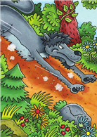 Wolf is mad. Raccoon keeps playing tricks on him! Wolf goes to sleep. Raccoon puts mud on Wolf’s eyes. Wolf wakes up, but he can’t see! Brown Bird is nice. He helps Wolf. Wolf wants to do something nice for Brown Bird. He says he can make Brown Bird pretty. Wolf will make him Red Bird.