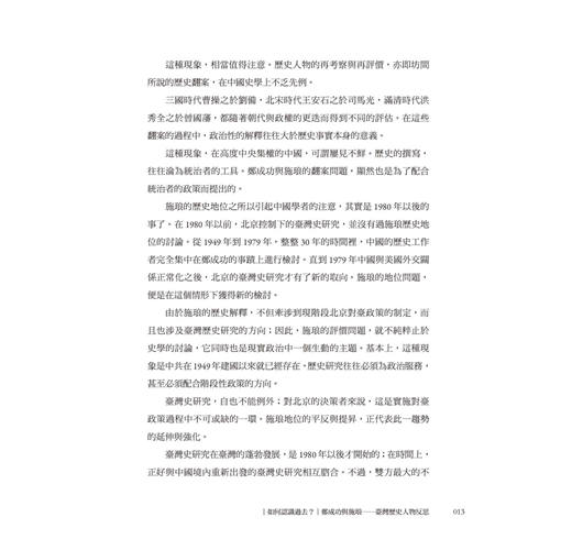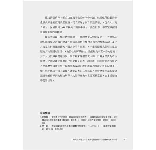 陳芳明這篇〈鄭成功與施琅──臺灣歷史人物評價的反思〉,考察鄭成功和施琅歷史評價的變遷,特別注意到有權力者如何詮釋鄭成功,及中共史家如何替施琅翻案。題文中的「反思」,一來是提醒我們要注意在歷史人物的翻案過程中,政治性的解釋往往大過於歷史事實本身的意義;其次,也教導我們應該從什麼立場來評價歷史人物,以避免歷史為政治服務,又如何建立臺灣自己的史觀;再者,如何從不同角度來看待歷史人物或歷史事件?原住民看待鄭成功的視角應該和傳統史書的紀錄不一樣,也不應該一樣;最後,就學習者的立場來說,學會尊重多元的歷史記憶和看待不同的歷史解釋,比記得歷史事實還更具意義,也才是歷史學習的目的。