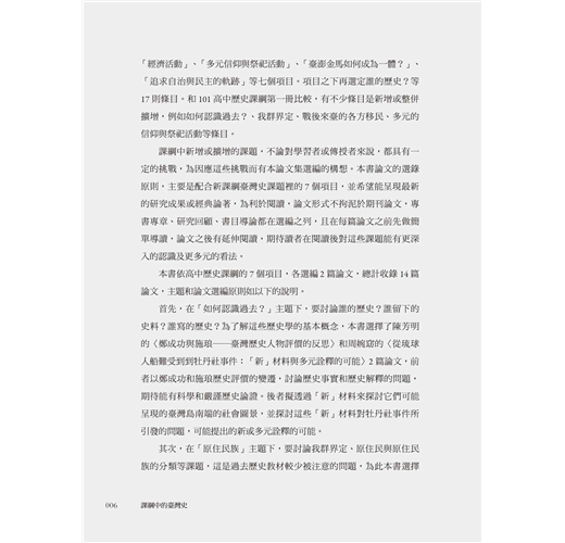 新課綱期待這些和當代世界攸關的基本歷史課題,能藉由發現、理解,進而面對問題和提出解決方案,但不論對學習者或傳授者來說,都具有一定的挑戰,以原住民族的課題來說,過去教科書大多只寫原住民族的分類和祭儀文化等知識點,現行課綱則希望探討我群如何界定?又族群如何被分類?及各時期原住民族所面臨的挑戰和回應等課題。為因應這些挑戰而有本論文集選編的構想,論文的選錄原則,主要是配合新課綱臺灣史課題裡的7個項目,及希望能呈現最新的研究成果或經典論著。論文形式不拘泥於期刊論文,專書專章、研究回顧、書目導論都在選編之列,且在每篇論文之前先做簡單導讀,論文之後有延伸閱讀和重點掃描,期待讀者在閱讀後對這些課題能有更深入的認識及更多元的看法。