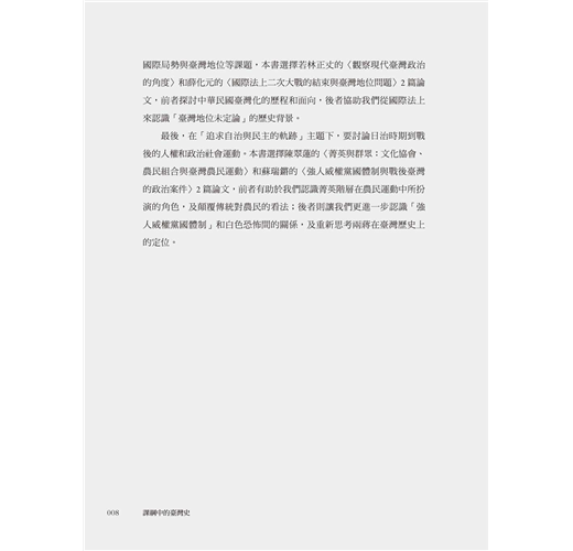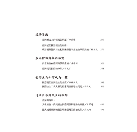 最後,在「追求自治與民主的軌跡」主題下,要討論日治時期到戰後的人權和政治社會運動。本書選擇陳翠蓮的〈菁英與群眾:文化協會、農民組合與臺灣農民運動〉和蘇瑞鏘的〈強人威權黨國體制與戰後臺灣政治案件〉2篇論文,前者有助於我們認識菁英階層在農民運動中所扮演的角色,及顛覆傳統對農民的看法;後者則讓我們更進一步認識「強人威權黨國體制」和白色恐怖間的關係,及重新思考兩蔣在臺灣歷史上的定位。