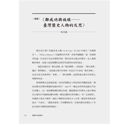 要理解歷史這兩層意義,如何評價歷史人物是很好的觀察途徑,鄭成功歷史評價的變遷即是絕佳例子。1661年,鄭成功率軍取道鹿耳門攻打荷蘭人,這一役扭轉臺灣的歷史命運,讓孤懸海外的彈丸之地丕變成為日後四百年國族紛擾的焦點。鄭成功雖然打敗荷蘭人,然「反清復明」的國族大業並不順利,嫡長子鄭經的表現也令人失望,國事家事對他來說並「不成功」,讓他來臺第二年即鬱憤而死,但他的歷史評價在17世紀以後的中國卻是無與倫比。